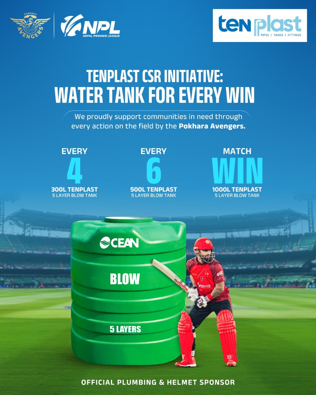 प्रत्येक चौका ३ सय लिटर टेनप्लास्ट पानी ट्याङ्की, प्रत्येक छक्का — ५ सय लिटर पानी ट्याङ्की,टिमले जिते प्रत्येक खेल — १००० लिटरपानी ट्याङ्की कम्पनीका अनुसार यी ट्यांकीहरू स्वच्छ पानी अभाव रहेको समुदाय, विद्यालय र स्थानीय संरचनामा उपलब्ध गराइनेछ । अभियानले सुरक्षित पानी पहुँच, स्वास्थ्य सुरक्षाअनुकूल अभ्यास र दीर्घकालीन प्रभावमा योगदान गर्ने अपेक्षा राखिएको छ ।