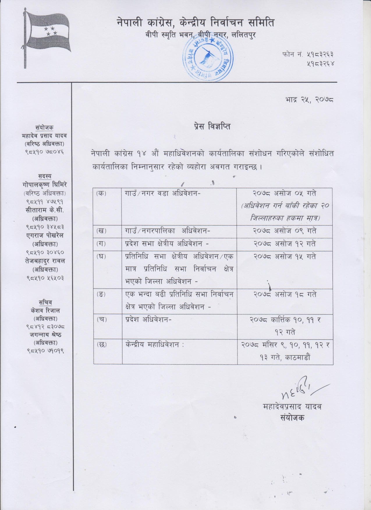 भाद्र २५ काठमाडौँ – नेपाली कांग्रेसले पाँचौपटक पार्टीका तल्ला तहको अधिवेशनको कार्यतालिका हेरफेर गरेको छ।