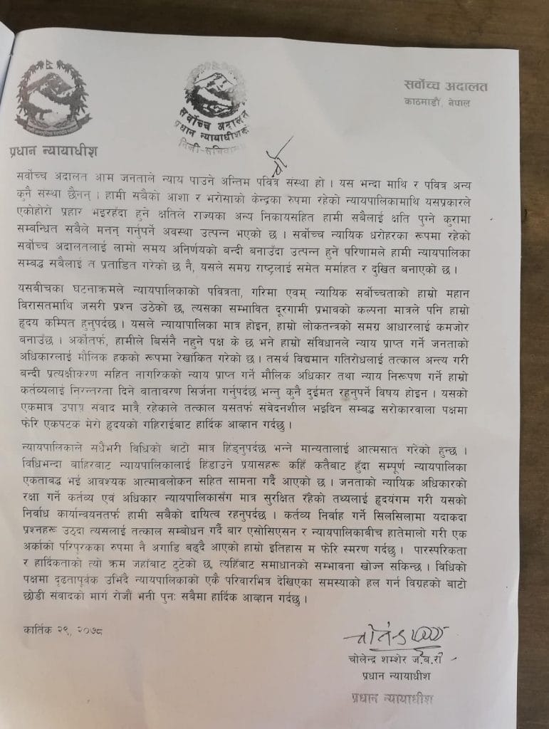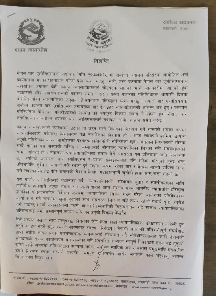 विज्ञप्तिमा भनिएको छ, ‘पारस्परिकता र हार्दिकताको त्यो क्रम जहाँबाट टुटेको छ, त्यहीँबाट समाधानको सम्भावना खोज्न सकिन्छ। विधिको पक्षमा दृढतापूर्वक उभिँदै न्यायपालिकाको एकै परिवारभित्र देखिएका समस्याको हल गर्न विग्रहको बाटो छोडी संवादको मार्ग रोजौं भनी सबैमा हार्दिक आह्वान गर्दछु।’