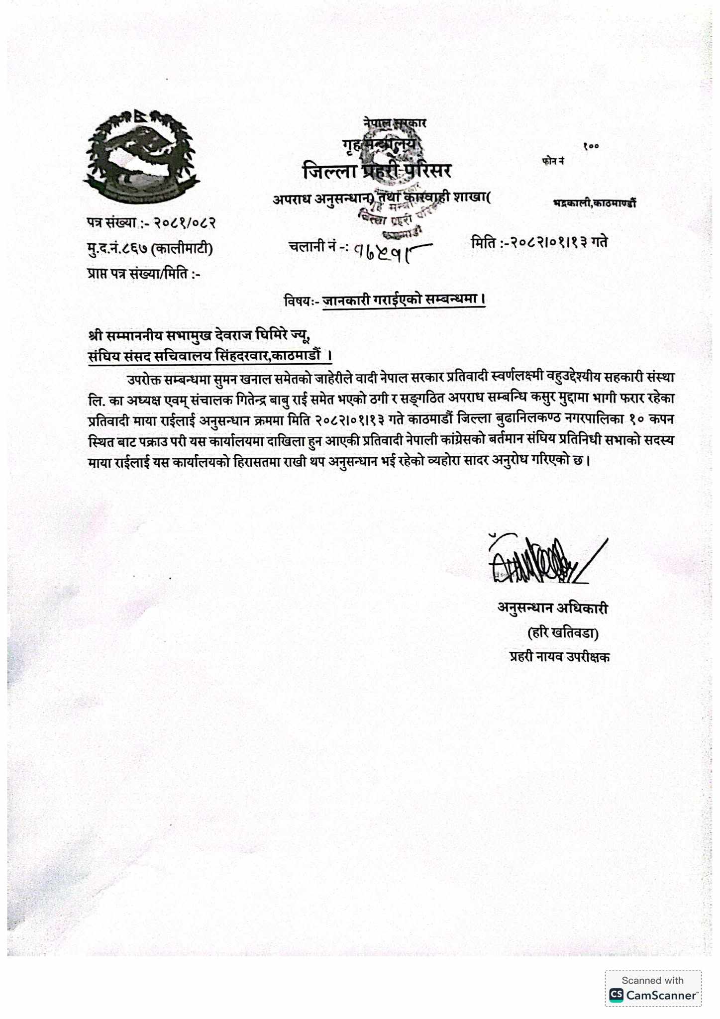 जिल्ला प्रहरी परिसर काठमाडौंले हिजो शनिबार नै संसद् सचिवालयलाई पत्र लेखेर सांसद राई पक्राउ परेको जानकारी गराएको हो ।