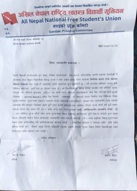 साथै, अतिरिक्त शुल्क फिर्ता नदिएसम्म आन्दोलनको विकल्प नरहेको पत्रमा जनाइएको छ । ‘लुटका विरुद्ध पीडित विद्यार्थीहरुलाई न्याय दिलाउन अनेरास्ववियु जोडदार माग गर्दछ ।’ अनेरास्ववियु गण्डकी कमिटीका सचिव आरके पोखरेल र संयोजक प्रकाश पौडेलद्वारा हस्ताक्षरित ध्यानाकर्षण पत्रमा उल्लेख छ ।