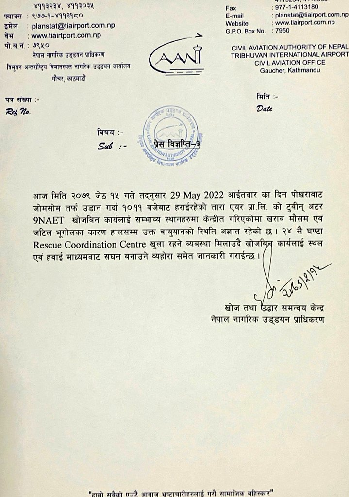 आइतबार एक विज्ञप्ति जारी गर्दै प्राधिकरणले विमानको खोजीलाई जारी राखिएको भए पनि हालसम्म अवस्थाबारे थाहा नभएको जनाएको हो ।
