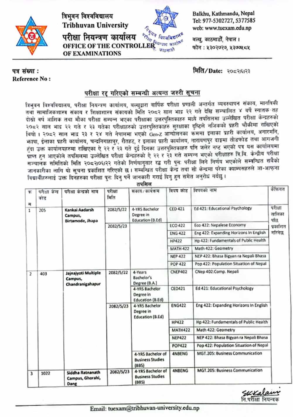 भदौ २२ र २३ गतेको जेनजी आन्दोलनका क्रममा झापाको कन्काई आदर्श क्याम्पस बिर्तामोड, रौतहट चन्द्रनिगाहपुरको जजनाज्योति क्याम्स र दाङको घोराहि स्थित सिद्ध रत्ननाथ क्याम्पस परीक्षा केन्द्रका परीक्षा रद्द गरिएको परीक्षा नियन्त्रण कार्यालयले जनाएको छ ।