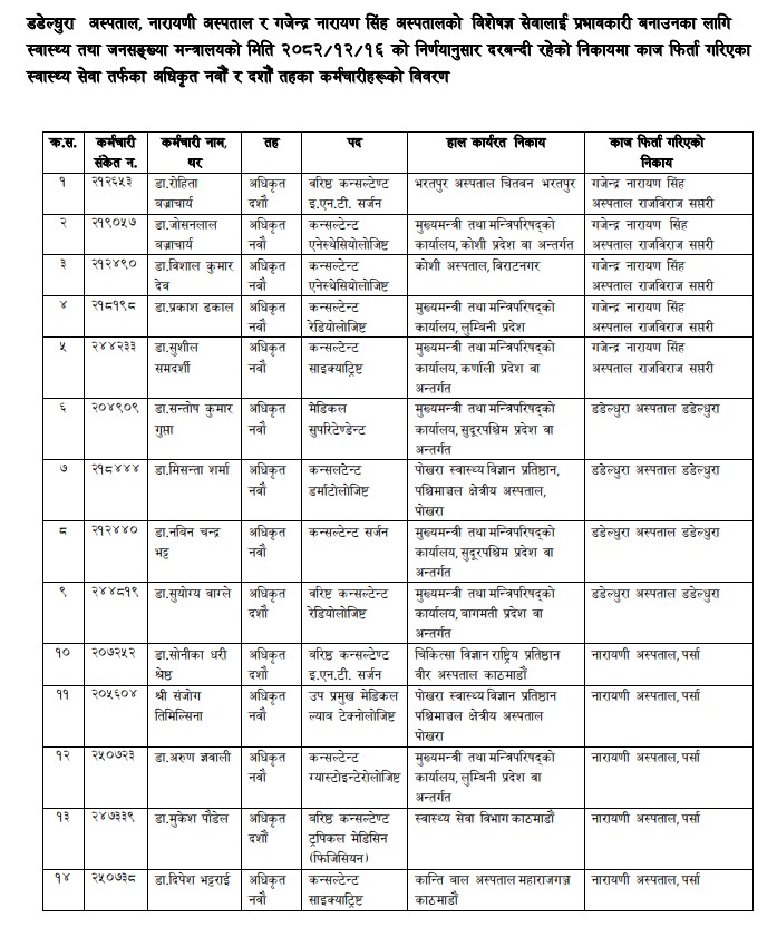 स्वास्थ्य तथा जनसंख्यामन्त्री निशा मेहताले देशभरि स्वास्थ्य सेवाको सन्तुलन मिलाउन तथा दुर्गम क्षेत्रमा विशेषज्ञ चिकित्सकको अभाव अन्त्य गर्न कडाइ गरेसँगै पहिलो चरणमा नवौँ र दशौँ तहका १४ जना विशेषज्ञ चिकित्सकलाई उनीहरूको दरबन्दी रहेको अस्पतालमा फिर्ता पठाइएकी छिन् ।
