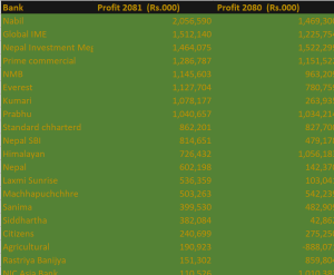 यस्तै स्टयान्डर्ड चार्टर्ड बैंकले ८६ करोड २२ लाख १ हजार, नेपाल एसबिआई बैंकले ८१ करोड ४६ लाख ५१ हजार, हिमालयन बैंकले ७२ करोड ६४ लाख ३२ हजार, नेपाल बैंकले ६० करोड २१ लख ९८ हजार, लक्ष्मी सनराइज बैंकले ५३ करोड ६३ लाख ५९ हजार रुपैयाँ नाफा आर्जन गरेका छन् ।