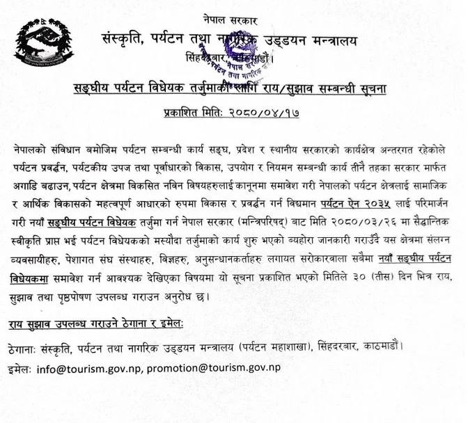 बुधबार मन्त्रालयले एक सूचना जारी गर्दे ३० दिनभित्र राजसुझाव पठाउन अनुरोध गरेको छ । मन्त्रिपरिषदबाट गत असार २६ गते संघीय पर्यटन विधेयक तर्जुमा गर्न सैद्धान्तिक स्वीकृति प्राप्त भएपछि मन्त्रालयले विधेयक बनाउन प्रक्रिया सुरु गरेको हो । २०३५ सालमा बनेको पर्यटन ऐनलाई परिमार्जन गर्नुपर्ने देखिएको मन्त्रालयका प्रवक्ता एवं सहसचिव राजेन्द्र कुमार केसीले बताए । उनले भने,‘ ऐन पुरानो भयो, अहिले पर्यटन क्षेत्रमा धेरै कामहरु भएका छन्, सबैलाई नियमन गर्ने हेतुले समयसापेक्ष ऐन बनाउनुपर्छ भनेरै प्रक्रिया थालिएको हो ।’