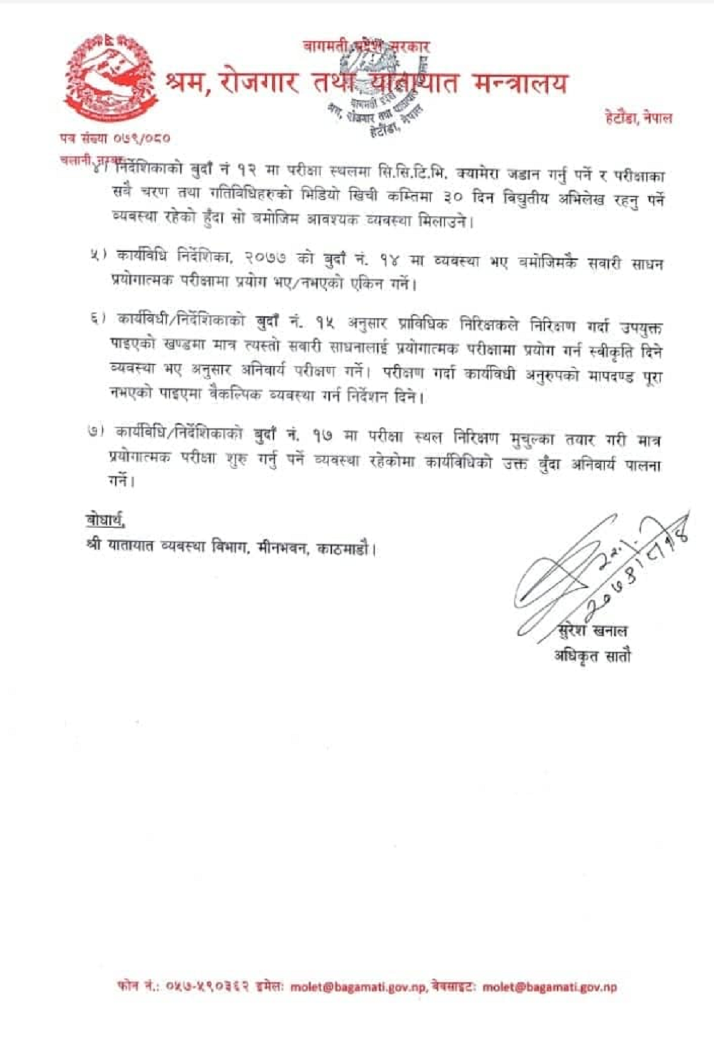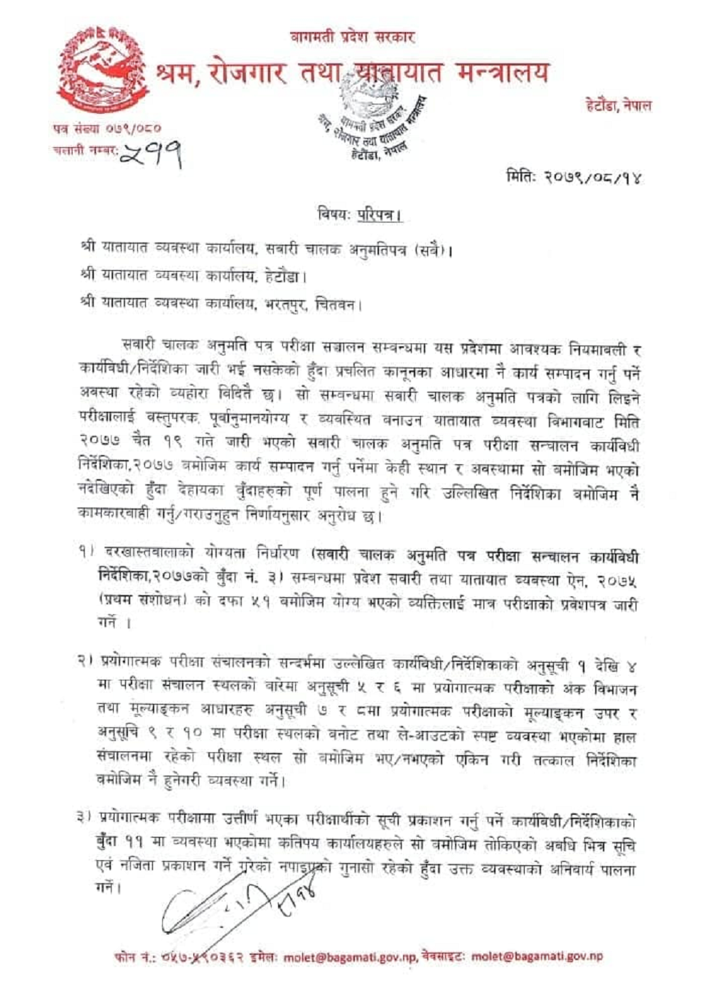 यातायात व्यवस्था विभागले २०७७ चैत १९ गते जारी भएको सवारी चालक अनुमतिपत्र परीक्षा सञ्चालन कार्यविधि निर्देशिकाबमोजिम कार्य गर्न परिपत्र गरेको छ।