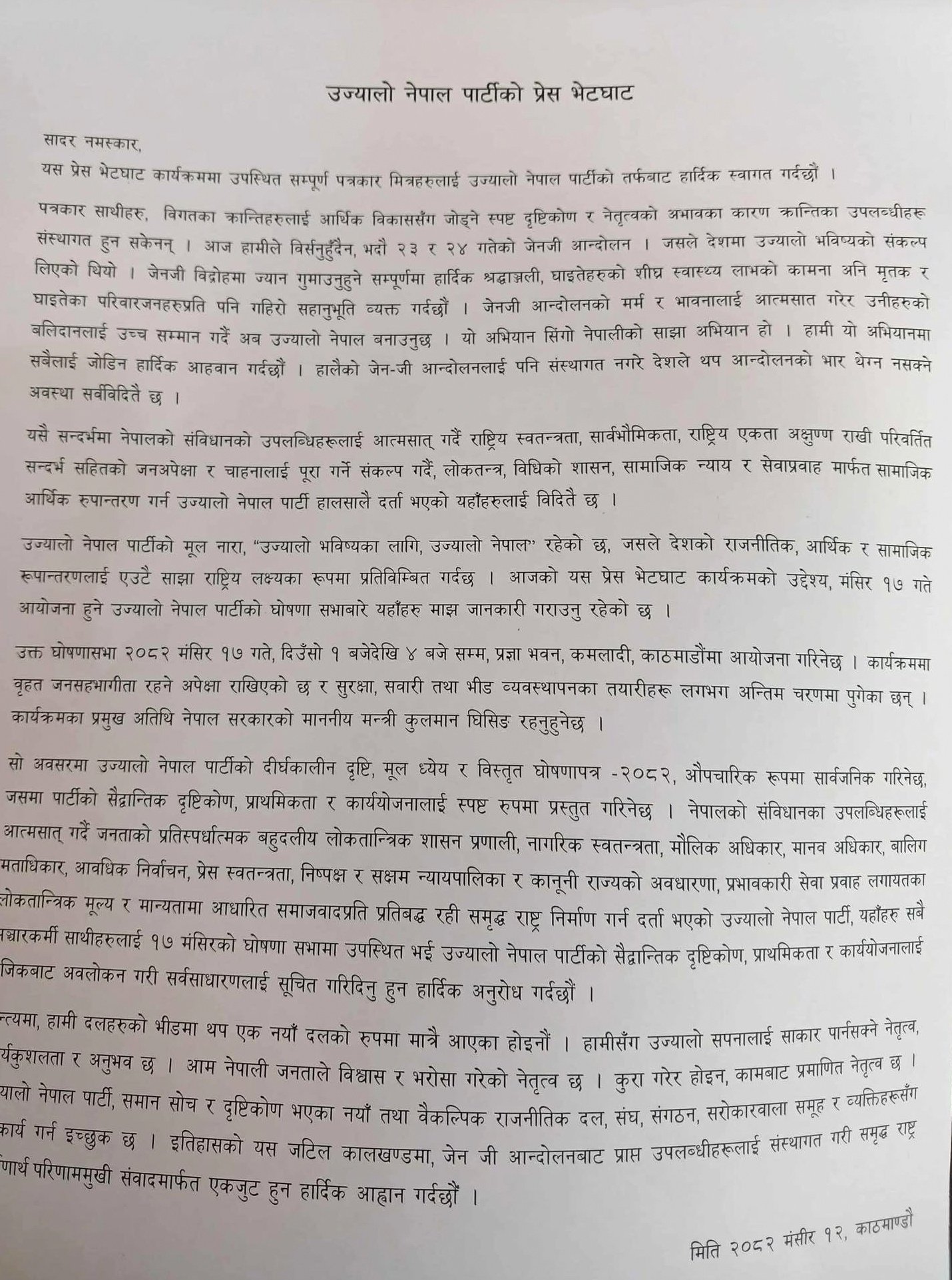 शुक्रबार पत्रकार सम्मेलन गरेर १७ गते, दिउँसो १ बजेदेखि ४ बजेसम्म प्रज्ञा भवन, कमलादी काठमाडौँमा घोषणासभा हुने जानकारी गराइएको हो ।