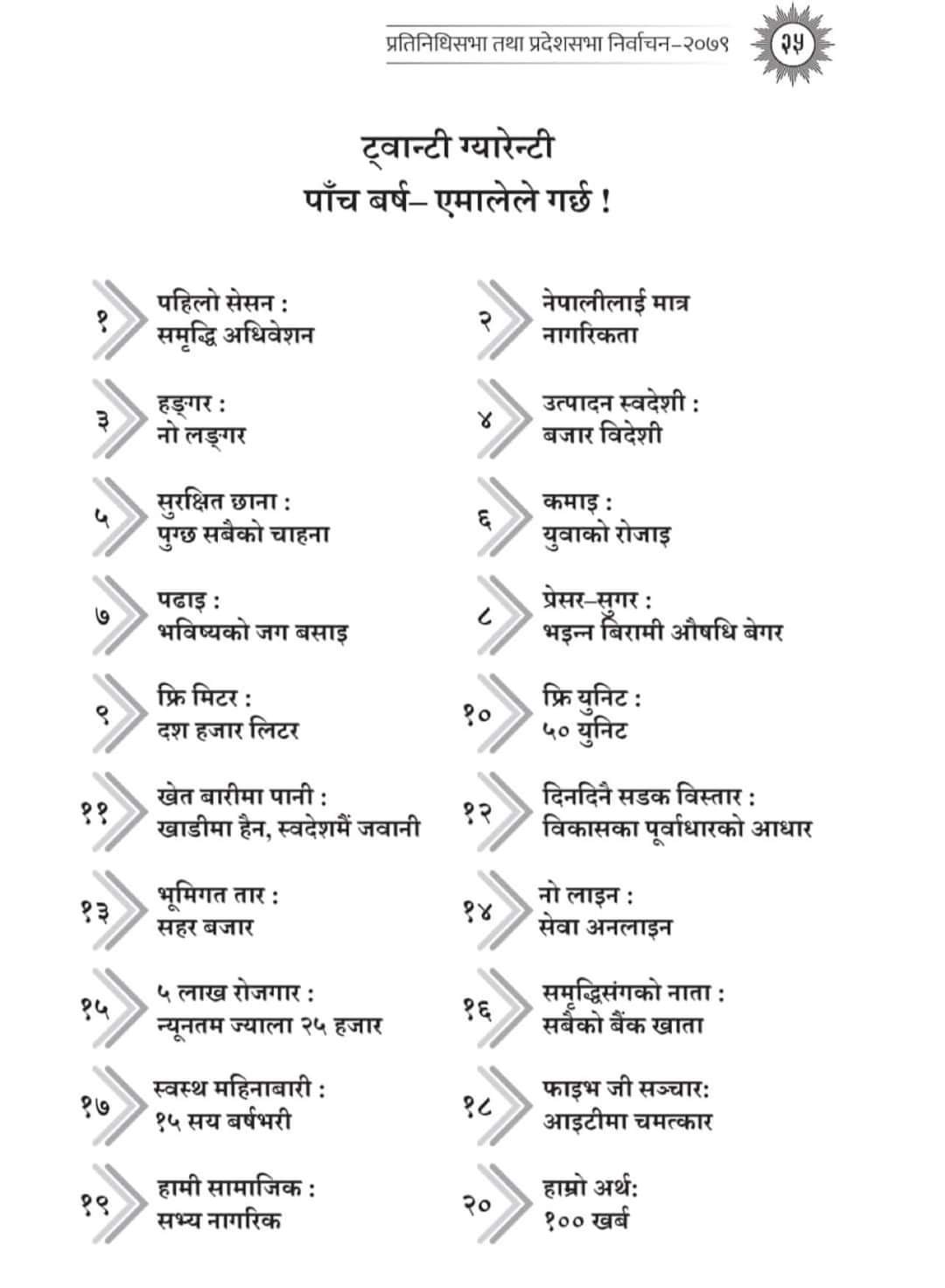 एमालेले २० ग्यारेन्टीसहितको चुनावी घोषणापत्र सार्वजनिक गरेको छ । जसमा ‘पाँच वर्षः एमालेले गर्छ’ भनेर नारा अघि सारिएको छ ।