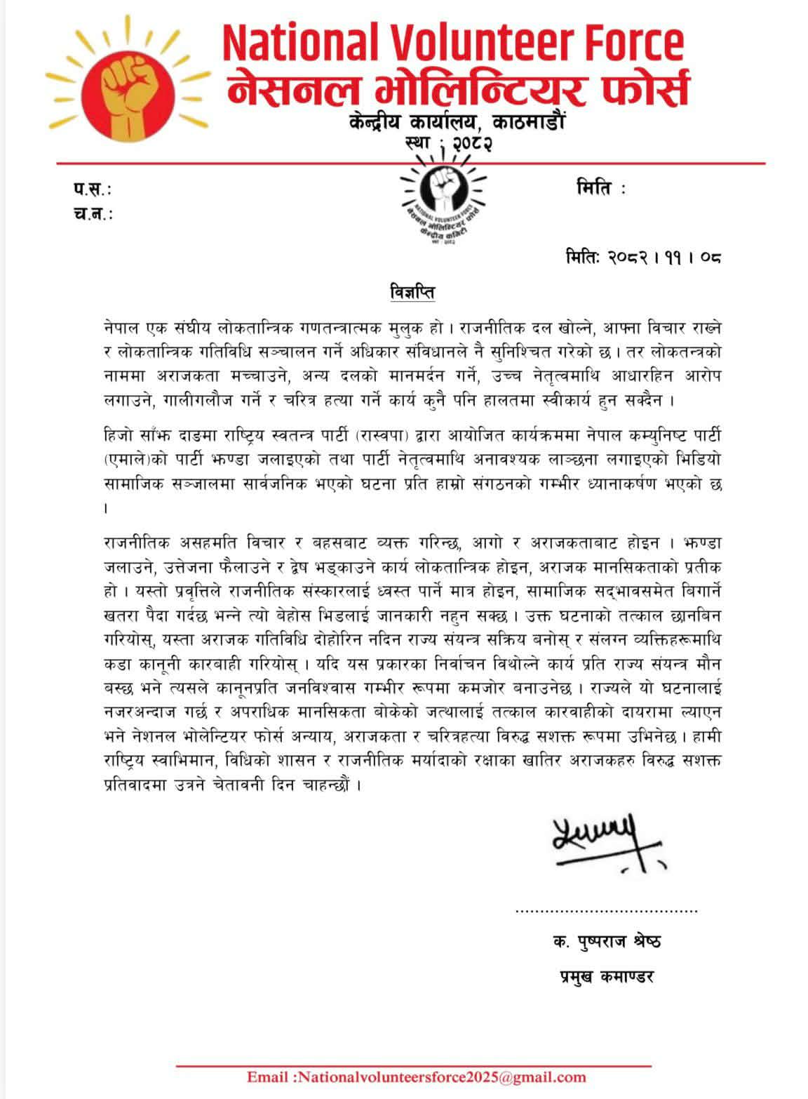 ‘हिजो साँझ दाङमा राष्ट्रिय स्वतन्त्र पार्टी (रास्वपा)द्वारा आयोजित कार्यक्रममा नेपाल कम्युनिस्ट पार्टी (एमाले)को पार्टी झण्डा जलाइएको तथा पार्टी नेतृत्वमाथि अनावश्यक लाञ्छना लगाइएको भिडियो सामाजिक सञ्जालमा सार्वजनिक भएको घटनाप्रति हाम्रो संगठनको गम्भीर ध्यानाकर्षण भएको छ,’ विज्ञप्तिमा भनिएको छ, ‘राज्यले यो घटनालाई नजरअन्दाज गर्छ, र अपराधिक मानसिकता बोकेको जत्थालाई तत्काल कारबाहीको दायरामा ल्याएन भने नेसनल भोलिन्टयर फोर्स यस्ता कार्यका विरुद्ध सशक्त रूपमा उभिनेछ । हामी राष्ट्रिय स्वाभिमान, विधिको शासन र राजनीतिक मर्यादाको रक्षाका खातिर अराजकविरुद्ध सशक्त प्रतिवादमा उत्रने चेतावनी दिन चाहन्छौँ ।’