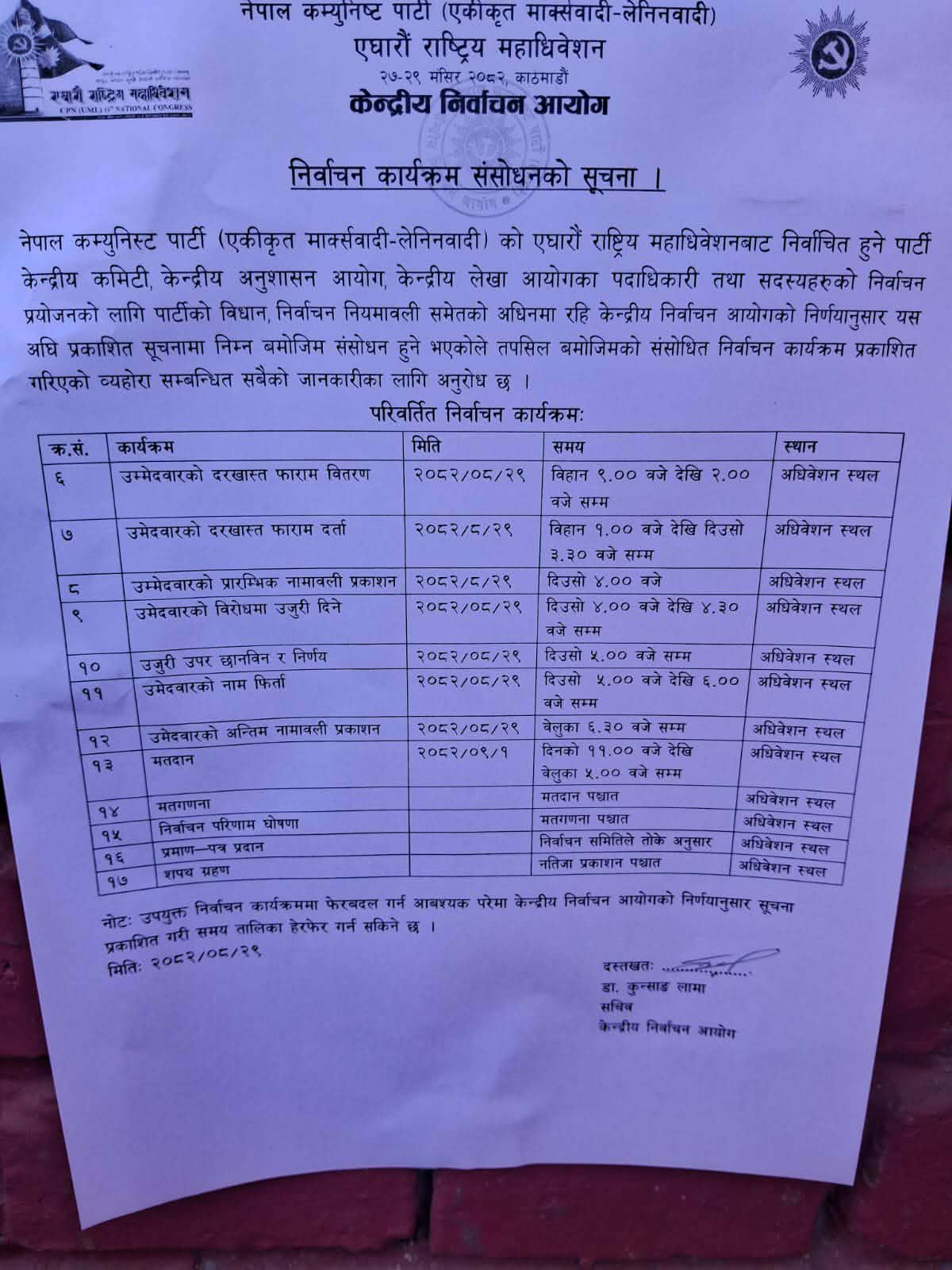 सूचनामा भनिएको छ, ‘महाधिवेशनबाट निर्वाचित हुने पार्टी केन्द्रीय कमिटी, केन्द्रीय अनुशासन आयोग, केन्द्रीय लेखा आयोगका पदाधिकारी तथा सदस्यहरूको निर्वाचन प्रयोजनको लागि पार्टीको विधान, निर्वाचन नियमावली समेतको अधीनमा रही केन्द्रीय निर्वाचन आयोगको निर्णयानुसार यसअघि प्रकाशित सूचनामा निम्नबमोजिम संशोधन हुने भएकोले तपसिल बमोजिमको संशोधित निर्वाचन कार्यक्रम प्रकाशित गरिएको व्यहोरा सम्बन्धित सबैको जानकारीका लागि अनुरोध छ।’