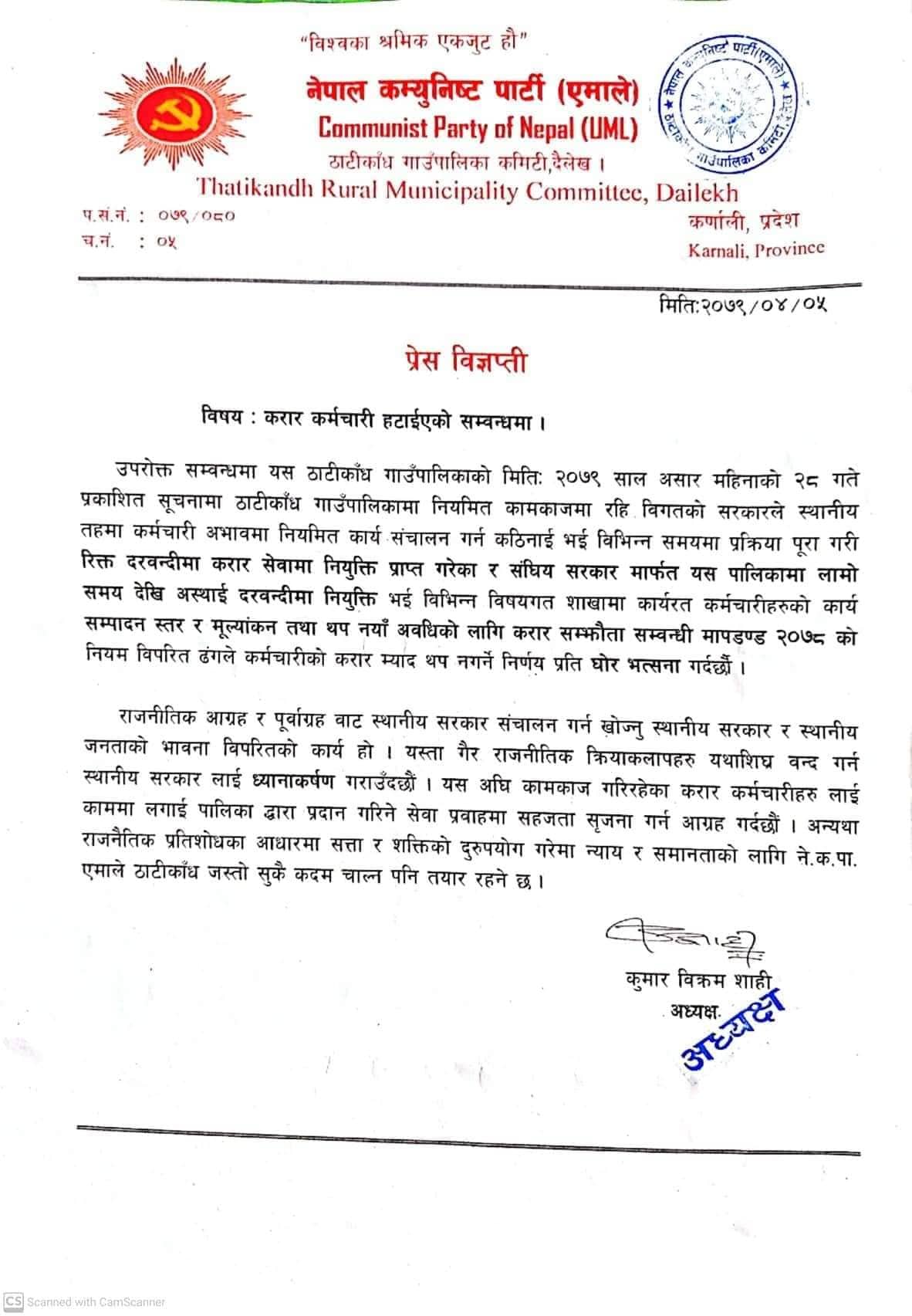काठमाडौँ । दैलेखको ठाटीकाँध गाउँपालिकाले करार कर्मचारी हटाएपछि एमालेले विरोध गरेको छ । नेकपा (एमाले) ठाटीकाँध गाउँपालिका कमिटीले बिहीबार विज्ञप्ति जारी गर्दै विरोध जनाएको हो ।
