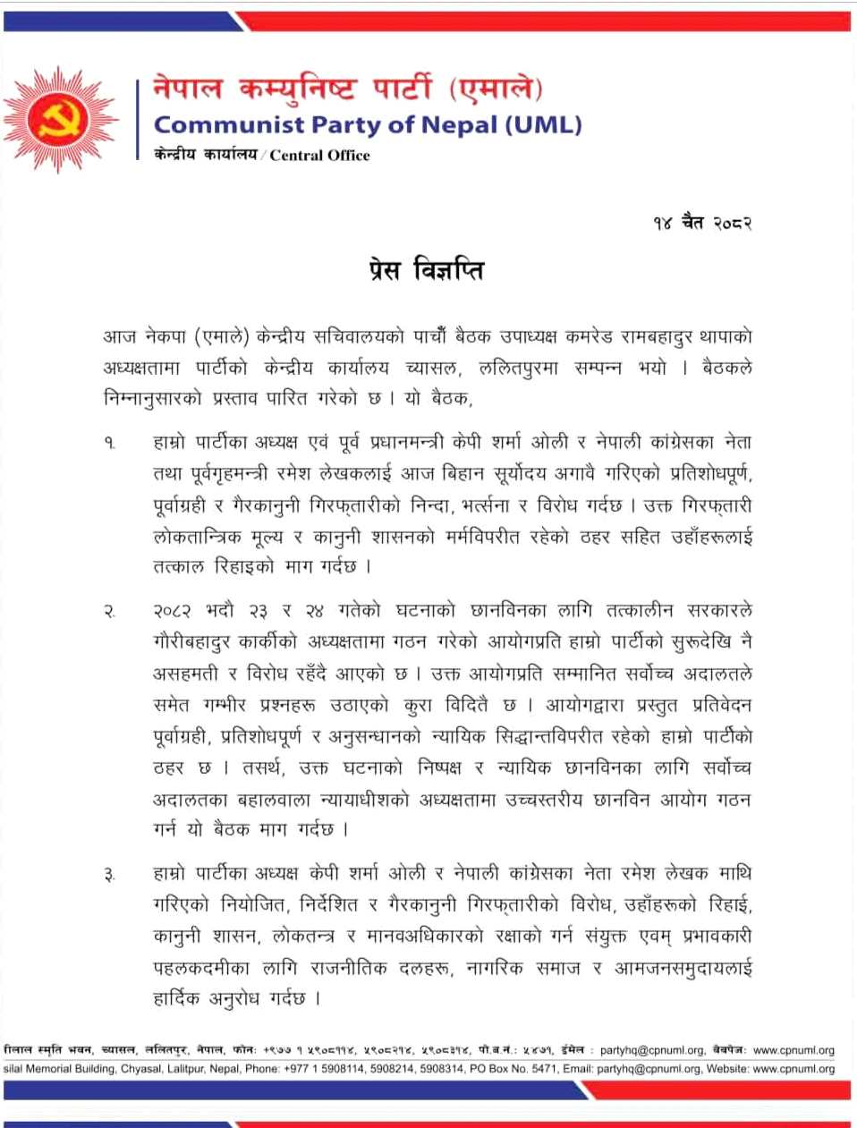 बैठकले पार्टी अध्यक्ष केपी शर्मा ओली र नेपाली कांग्रेसका नेता रमेश लेखकको गिरफ्तारीको निन्दा र भत्र्सना पनि गरेको छ ।