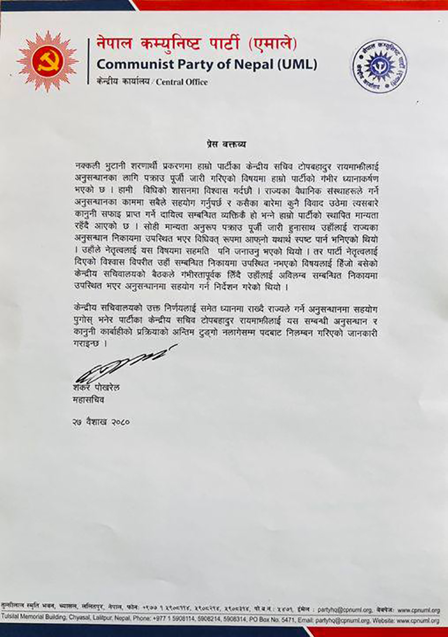 मंगलबार बसेको नेकपा एमालेको सचिवालय बैठकले टोपबहादुरलाई अनुसन्धानमा सघाउन आग्रह गर्ने निर्णय गरेको थियो ।