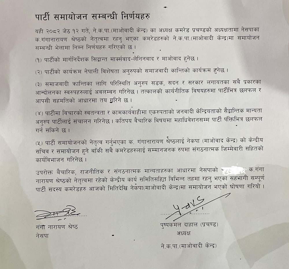 माओवादी केन्द्रका अध्यक्ष पुष्पकमल दाहाल ‘प्रचण्ड’ र नेसपाका अध्यक्ष श्रेष्ठबीच सहमतिपत्रमा हस्ताक्षर र पत्र आदानप्रदान भएसँगै दुवै दलबीच एकता भएको हो ।