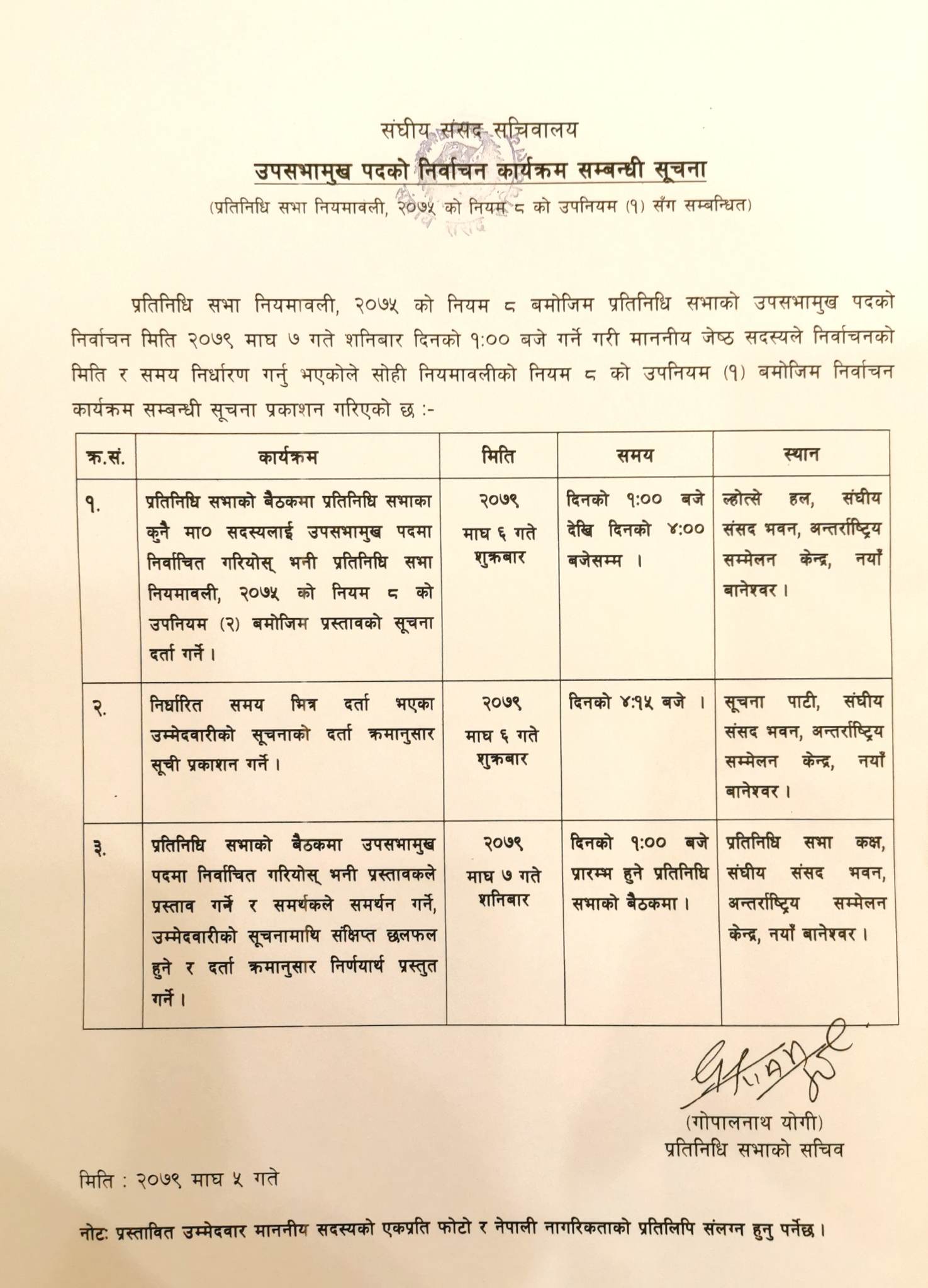 जसमा माघ ६ गते शुक्रबार दिउँसो १ देखि ४ बजेसम्म उम्मेदवारी दर्ता र सोही दिन सवा चार बजे उम्मेदवारको सूची प्रकाशित गरिनेछ । माघ ७ शनिबार १ बजे बस्ने प्रतिनिधि सभामा उम्मेदवारको प्रस्तावमाथि छलफल निणार्यथ प्रस्तुत गर्ने कार्यक्रम छ ।