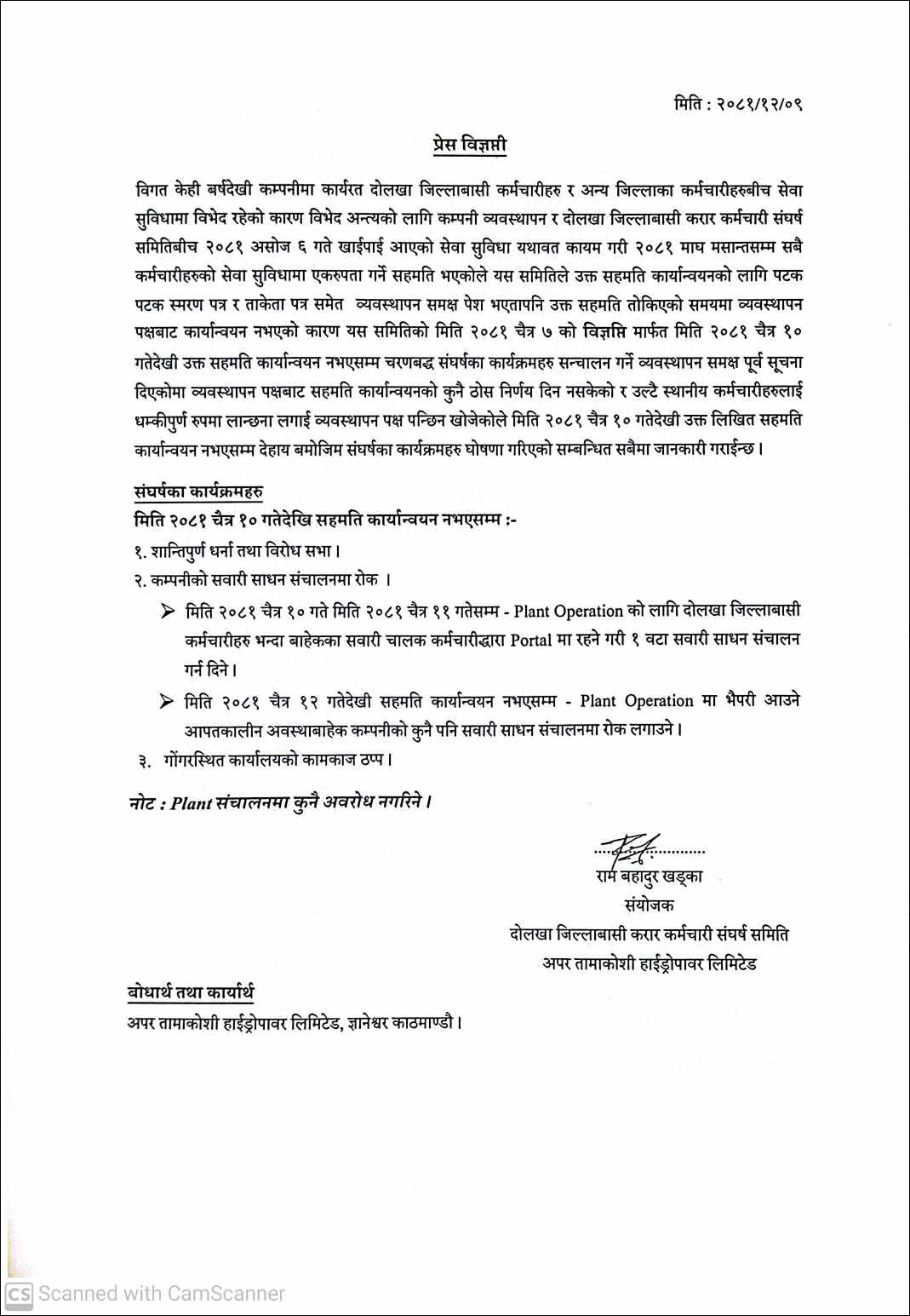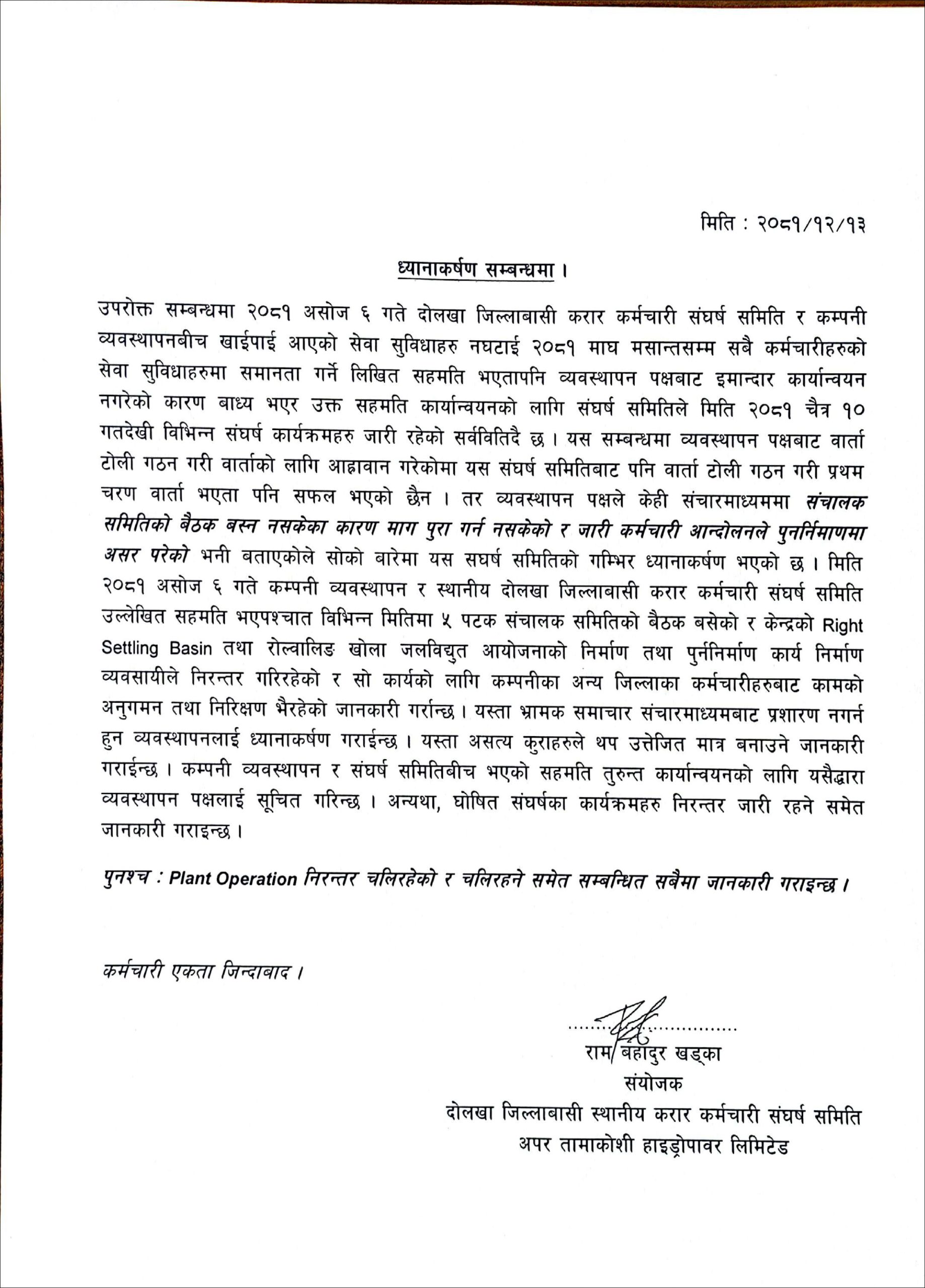 असोज ६ गते भएको सहमति कार्यान्वयन गर्न पटक–पटक पत्राचार गर्दा कम्पनीले बेवास्ता गरेपछि आफूहरू संघर्षमा उत्रिन बाध्य भएको उनको भनाइ छ । ‘हामीले यही चैत ७ गते एउटा विज्ञप्ति जारी गरेर चैत १० गतेभित्र पुरानो सहमति कार्यान्वयन गर्न कम्पनी व्यवस्थापनलाई आग्रह गरेका थियौँ । तर, उहाँहरूले त्यसलाई पनि बेवास्ता गर्नुभयो,’ संयोजक खड्काले भने, ‘हामीले विनम्रतापूर्वक ध्यानाकर्षण गराउँदा उल्टै हामीलाई धम्कीपूर्ण भाषा प्रयोग गर्दै लाञ्छनाहरू लगाउने काम भयो । त्यसकारण हामी संघर्षमा उत्रिन पर्यो । अब हामीसँगको सहमति कार्यान्वयन नभएसम्म यो सङ्घर्ष जारी रहने छ ।’