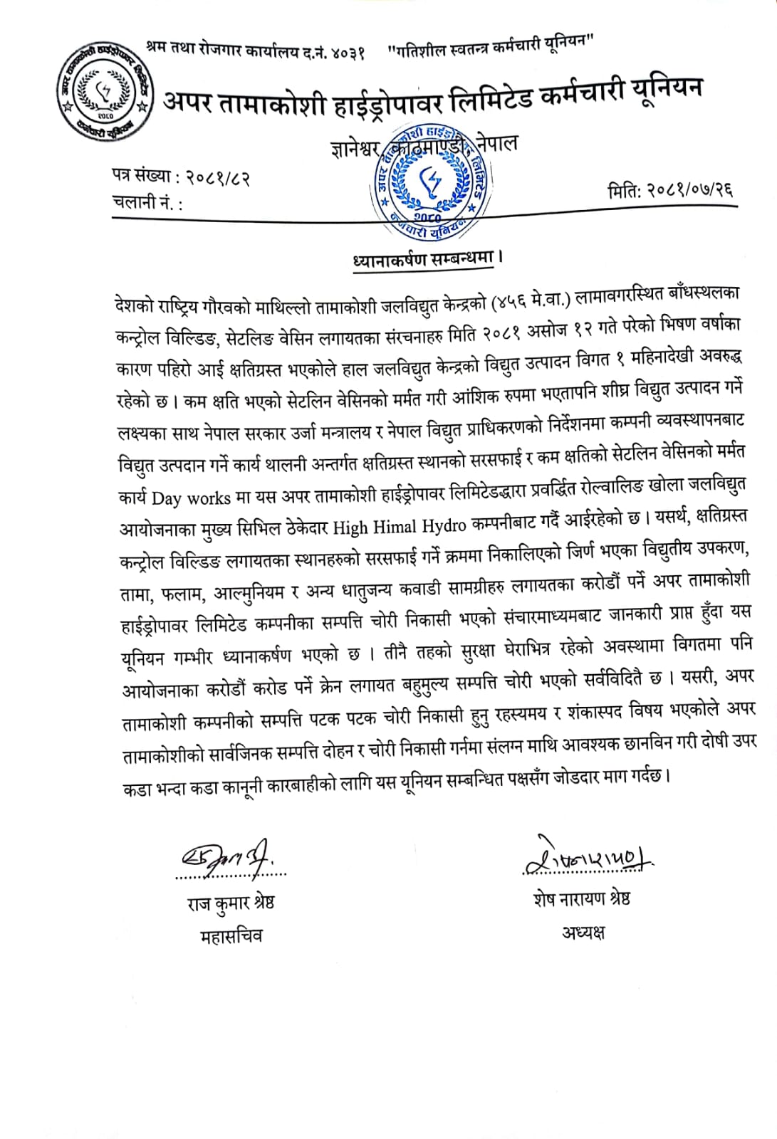 युनियनका अध्यक्ष शेषनारायण श्रेष्ठ र महासचिव राजकुमार श्रेष्ठद्वारा संयुक्त रूपमा हस्ताक्षर गरिएको ध्यानाकर्षणपत्रमा भनिएको छ, ‘क्षतिग्रस्त कन्ट्रोल विल्डिङलगायतका स्थानहरूको सरसफाइ गर्ने क्रममा निकालिएको जीर्ण भएका विद्युतीय उपकरण, तामा, फलाम, आल्मुनियम र अन्य धातुजन्य कवाडी सामग्रीहरूलगायतका करोडौं पर्ने अपर तामाकोशी हाइड्रोपावर लिमिटेड कम्पनीका सम्पत्ति चोरी निकासी भएको सञ्चारमाध्यमबाट जानकारी प्राप्त हुँदा यस युनियनको गम्भीर ध्यानाकर्षण भएको छ ।’