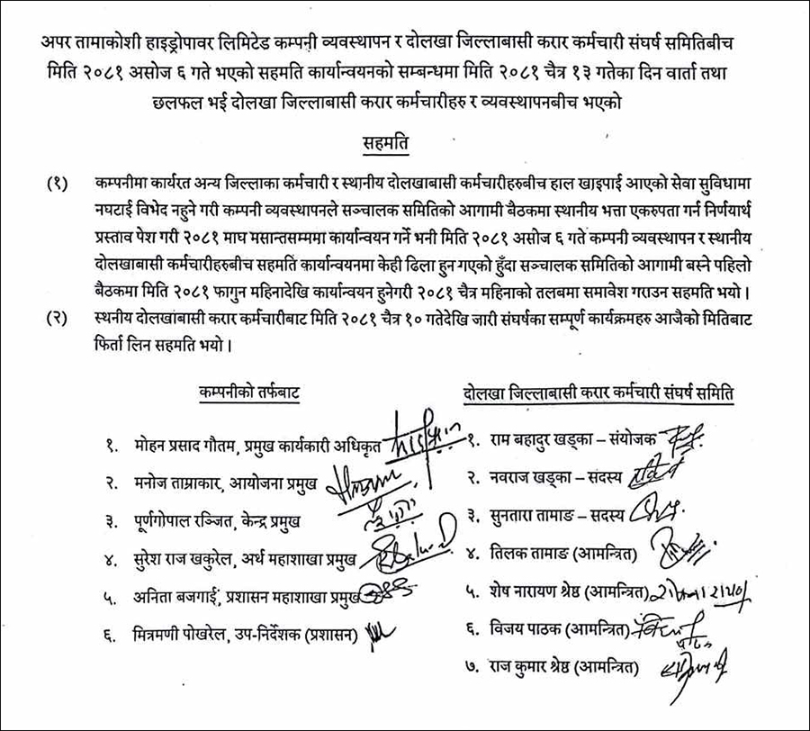 सहमति पत्रमा कम्पनीको तर्फबाट प्रमुख कार्यकारी अधिकृत मोहन प्रसाद गौतम, आयोजना प्रमुख मनोज ताम्राकार, केन्द्र प्रमुख पूर्णगोपाल रञ्जित, अर्थ महाशाखा प्रमुख सुरेश राज खकुरेल, प्रशासन महाशाखा प्रमुख अनिता बजगाईं र उप–निर्देशक (प्रशासन) मित्रमणि पोखरेलले हस्ताक्षर गरेका छन् । यसैगरी, दोलखा जिल्लावासी करार कर्मचारी संघर्ष समितिको तर्फबाट संयोजक रामबहादुर खड्का तथा सदस्यद्वय नवराज खड्का र सुनतारा तामाङले हस्ताक्षर गरेका छन् । यस्तै तिलक तामाङ, शेषनारायण श्रेष्ठ, विजय पाठक र राजकुमार श्रेष्ठले आमन्त्रित सदस्यका रूपमा सहमतिमा हस्ताक्षर गरेका छन् ।