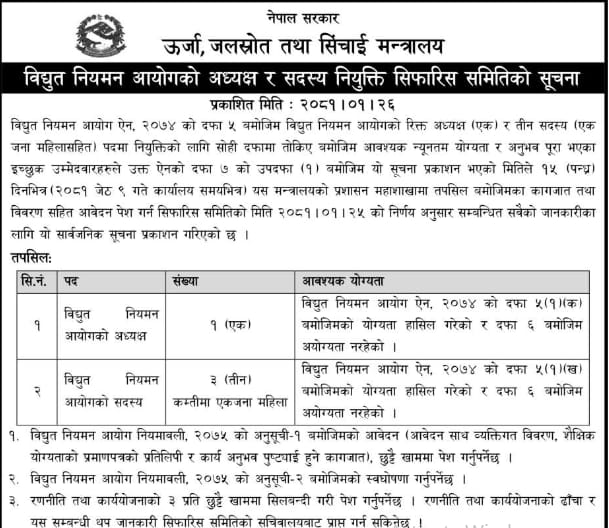 ऊर्जा, जलस्रोत तथा सिँचाइ मन्त्रालयले विद्युत् नियमन आयोग ऐन, २०७४ को दफा ५ अनुसार रिक्त अध्यक्ष र सदस्य पदमा नियुक्तिका लागि आवेदन माग गरेको हो ।