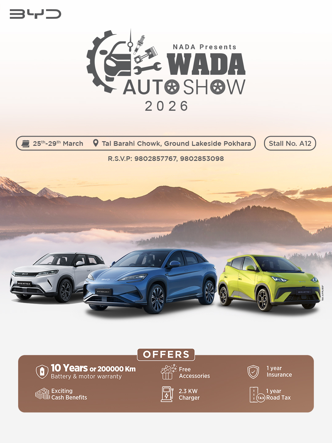 मार्च २५ देखि २९ (चैत ११–१५) सम्म तालबाराही चौरमा चल्ने अटो शोको स्टल ए१२मा बीवाईडीका आकर्षक मोडलहरू प्रदर्शन गरिएको छ। बीवाईडी एट्टो १ – सहरका लागि डिजाइन गरिएको कम्प्याक्ट इलेक्ट्रिक एसयूभी, बीवाईडी एट्टो २ – दैनिक प्रयोगका लागि भर्सटाइल र कम्फर्टेबल इलेक्ट्रिक एसयूभी, बीवाईडी एट्टो ३ – नेपालकै नम्बर १ प्रिमियम इलेक्ट्रिक एसयूभी रहेको छन् ।