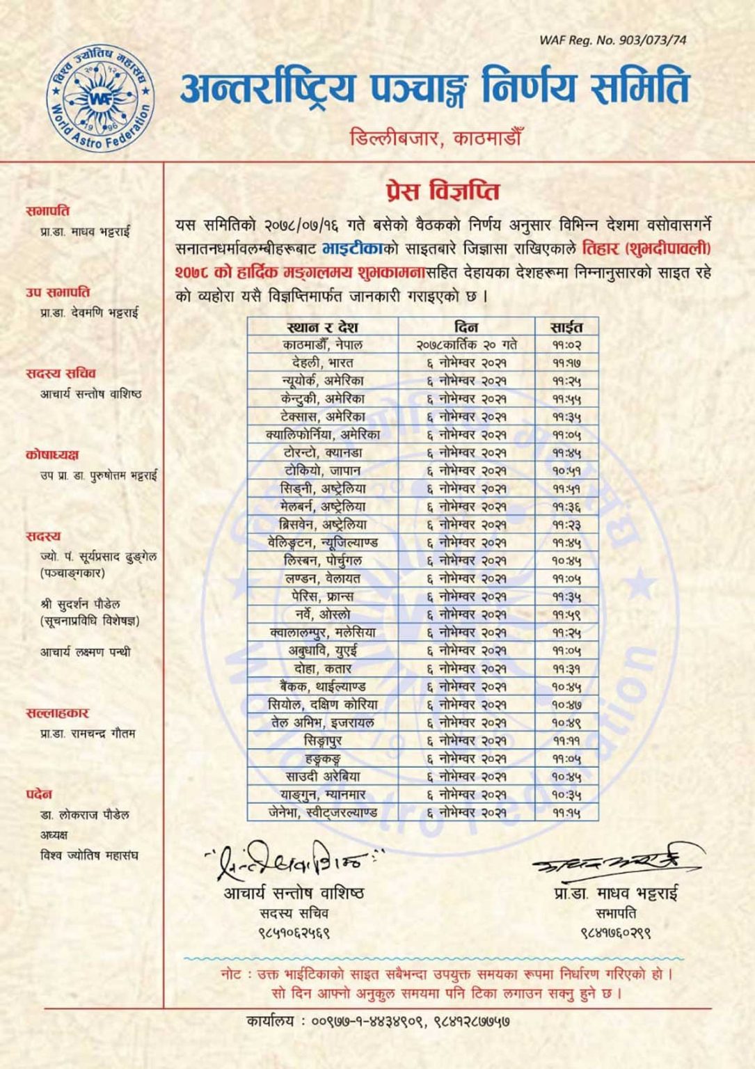 सर्वसाधारणका लागि मध्याह्नकालमा टीका लगाउनु पनि शास्त्रसम्मत् नै हुने जनाइएको छ । राज्य सञ्चालकले भने साइतमा टीका लगाउनुपर्छ । भाइपूजा र नेवारी भाषामा किजापूजा कात्तिक २० गते नै गरिन्छ । बेलुकी सूर्यास्त नभएसम्म भाइटिका लगाउन कुनै समस्या नरहेको समितिले जनाएको छ ।
