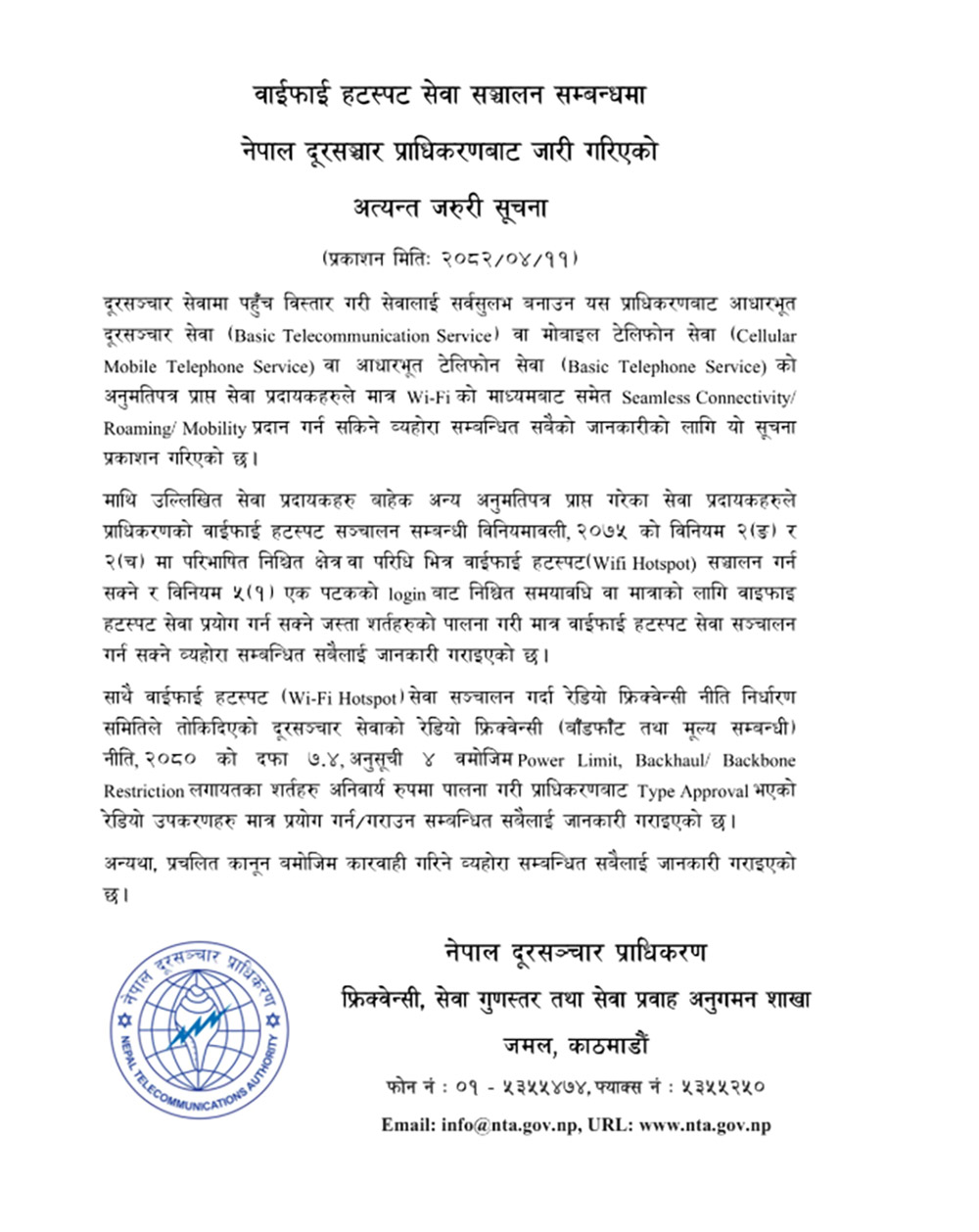 प्राधिकरणले सूचना प्रकाशित दूरसञ्चार सेवामा पहुँच विस्तार गरी सेवालाई सर्वसुलभ बनाउन प्राधिकरणबाट आधारभूत दूरसञ्चार सेवा वा मोबाइल टेलिफोन सेवा वा आधारभूत टेलिफोन सेवाको अनुमतिपत्र प्राप्त सेवा प्रदायकहरुले मात्र वाईफाई सेवा प्रदान गर्न सकिने बताएको छ ।