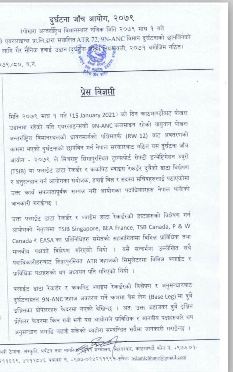काठमाडौँबाट पोखराका लागि उडेको जहाज पोखरा अन्तर्राष्ट्रिय विमानस्थलको धावनमार्गको पश्चिमतर्फ ‘रनवे वान टू’बाट अवतरण गर्ने क्रममा दुर्घटनामा परेको थियो । लगत्तै सरकारले दुर्घटना जाँच आयोग गठन गरेको थियो । आयोगले सिङ्गापुरस्थित ट्रान्सपोर्ट सेफ्टी इन्भेस्टिगेसन ब्यूरोमा फ्लाइट डाटा रेकर्डर र ककपिट भ्वाइस रेकर्डर डाटा विश्लेषण गरेको थियो । आयोगका संयोजक, हवाई विज्ञ र सदस्यसचिव सिङ्गापुर गएका थिए । उनीहरू अनुसन्धान र विश्लेषणपछि नेपाल फर्किएका छन् ।