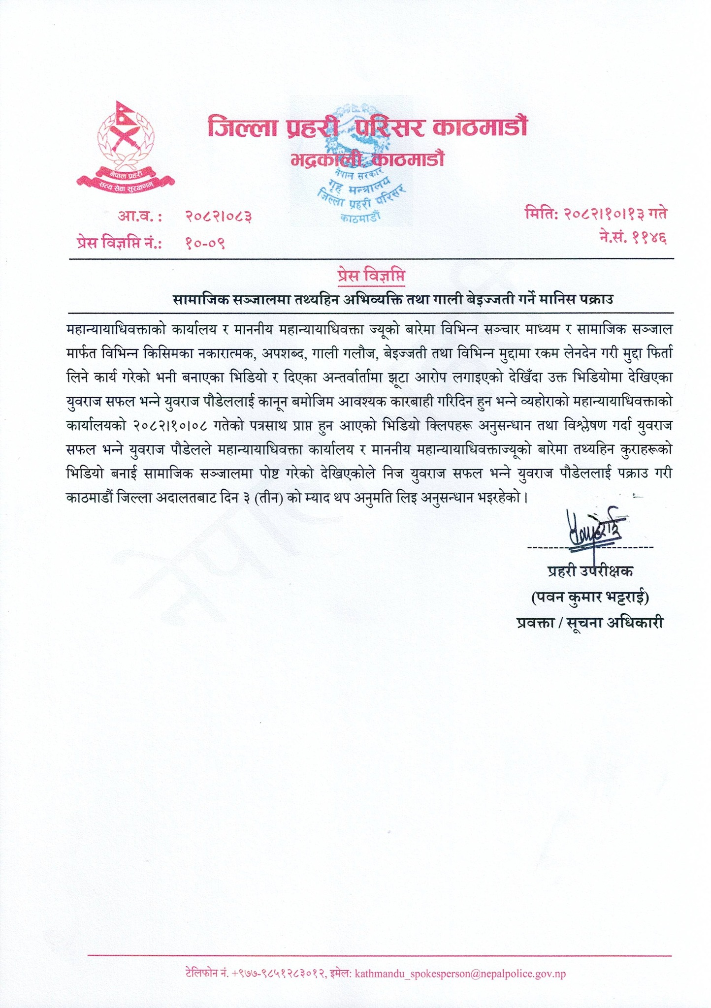 सामाजिक सञ्जालमा तथ्यहीन अभिव्यक्ति तथा गाली बेइजती गरेको आरोपमा उनलाई प्रहरीले पक्राउ गरेको हो ।