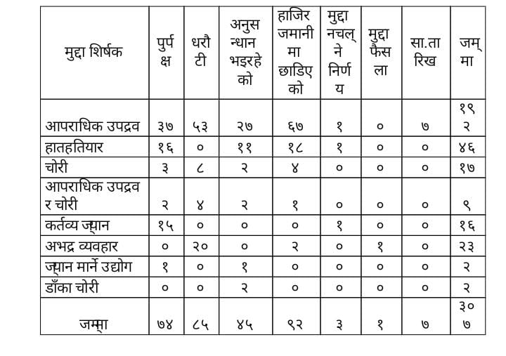 धरौटीमा रिहा हुनेमध्ये आपराधिक उपद्रव मुद्दामा ५३ जना छन् । चोरीका १२ र अभद्र व्यवहारका गरी धरौटीमा छुट्नेको संख्या ८५ पुगेको हो। जिल्ला प्रहरीको हिरासतमा अनुसन्धानका निम्ति अहिले ८५ जना राखिएका छन् ।